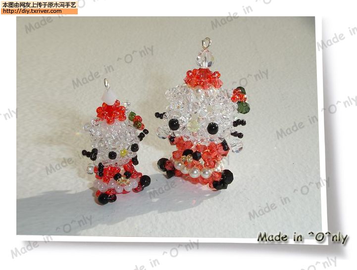 更新来了,12月14日我更新来啦^o^,其实这段时间做了还不少东西,满意的不多,随便发几个大家看看吧:) 继续研读静哉的书书,献上骷髅头一个:) 下面这个戒指是我做到现在最满意的一个呢:)大家看看喜不喜欢? 抱抱熊一个,准备给它配吊饰的,目前看来有点单调 礼服熊熊系列又多一员,最闪的一个:) 我爸爸妈妈给我宝宝的足金挂件,给他串起来,够重的咧:) 狗狗小黑,找骨头找骨头......米珠做的:) 快圣诞节了,让我最爱的hello kitty穿上圣诞节装吧:)小的是米珠做的,好像比水晶的差好多 谢谢来捧场的姐妹们,送上蛋糕两个,慢慢吃哦,好硬的